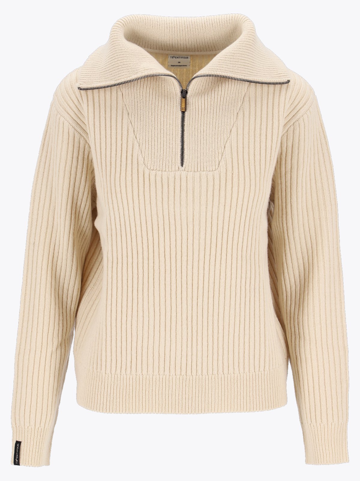 En myk strikkegenser i ullblanding med halfzip og høy nedbrettet krage. Genseren er strikket i dobbel rib og har en romslig fasong.