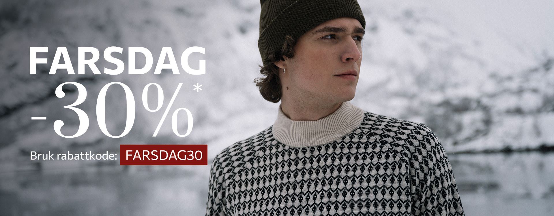 Rabattkoden FARSDAG30 gir -30%* på utvalgte plagg til herre merket med 'FARSDAG30'