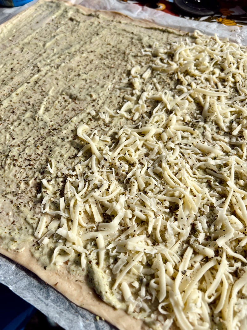 Brett ut pizzabunnen og smør utover sausen som består av 2/3 pesto og 1/3 creme fraiche.