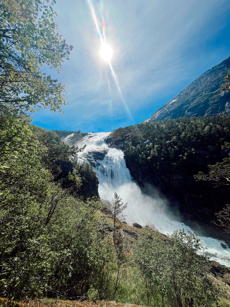 Når du kommer til Kinsarvik så svinger du av fra Rv 13 i sentrum, og følger den lokale veien inn til parkeringen. Det er skiltet til Husedalen fra hovedveien.