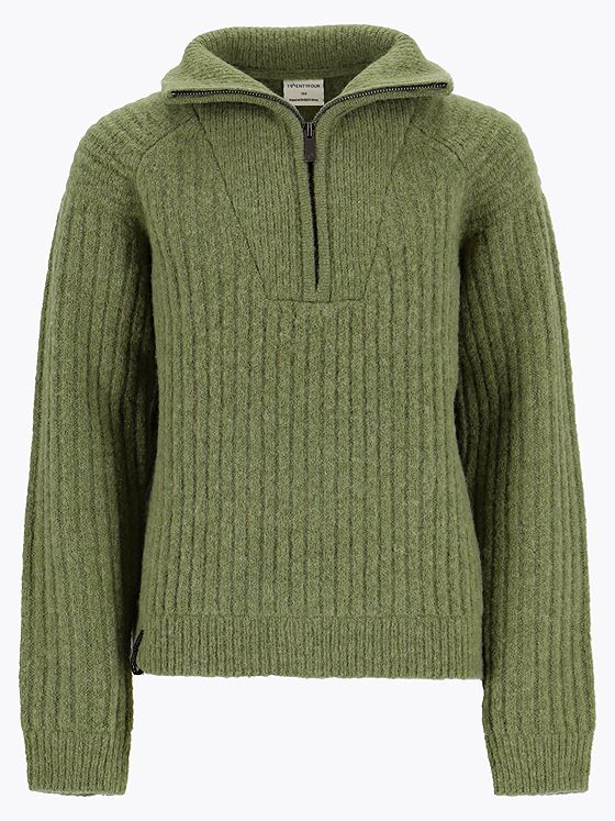 En myk strikkegenser i nydelig ullblanding med halfzip og dobbel rib krage. Genseren er strikket i 2x2 rib og har en romslig fasong. En favoritt under turjakka eller som kosegenser.
